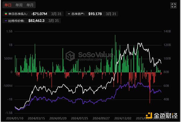 比特币现货ETF自3月14 日以来,其净流入连续 10 日超过净流出。不过在 3 月 21 日起,其净流入均未再超过 1 亿美元,3 月 28 日,终结了 10 日连续净流入,机构资金连续净流出。