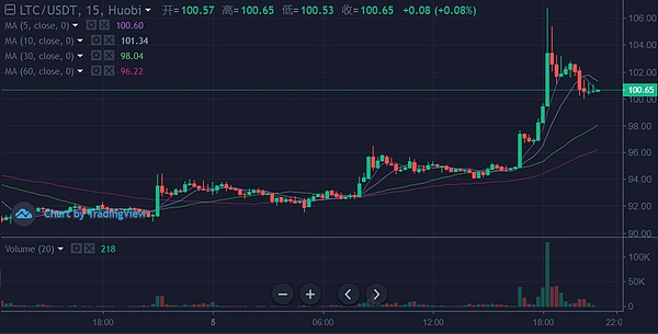 截至减产完成,LTC价格为104.48美元,24小时内涨幅约为13.6%。但戏剧性的行情变化发生莱特币减半前后的几小时——在减半前3小时,LTC价格连续上升,最高触及106.8美元;随着减半完成,LTC价格连续下跌,目前已跌破100美元。
