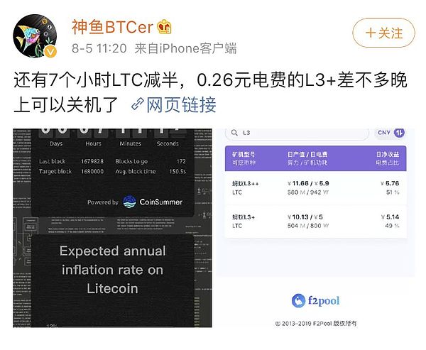 在莱特币减半的7个小时前,F2Pool联合创始人神鱼在微博上写道:“0.26元电费的L3+差不多晚上可以关机了。”神鱼提到的“L3+”是比特大陆在2017年推出的矿机,属于专门用来挖掘莱特币的L3系列。
