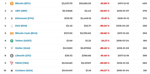 根据ATHCoinIndex提供的数据,大多数主流数字货币,像XRP、ETH、BCH、LTC和ADA,在过去12个月里较历史高点下跌了90%至97%。