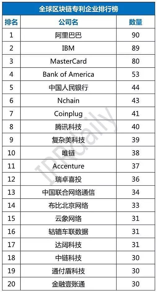 榜单显示,阿里巴巴以90项专利数排名第一,IBM和MasterCard分别以89、80专利数排榜单第二、三名。