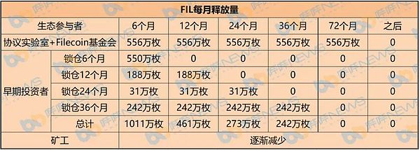 早期投资者手中的FIL,除去0.5亿枚暂时保留外,剩余的1.5亿枚FIL有6个月(22%)、12个月(15%)、24个月(5%)、36个月(58%)的线性解锁期,不同解锁期的FIL每个月分别释放550万枚、188万枚、31万枚、242万枚代币。