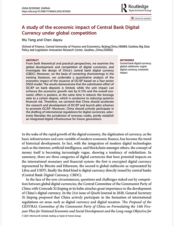 本文从理论和实践的角度考察了数字货币的全球发展和竞争,并研究了中国中央银行数字货(CBDC)的设计。此外,在修正现有文献不足的基础上,本文基于四部门DSGE模型对DC / EP发行的经济影响进行了定量分析。结果表明,DC / EP在银行存款上的替代效应是有限的,单位影响可以使经济增长率提高0.15%,整体经济效果是积极的,同时在一定程度上降低了杠杆比率,有利于降低系统性财务风险。因此,作者认为中国应加快DC / EP的研发,并启动试点计划以促进DC / EP。此外,中国应积极参与国际数字货币法规的起草,有选择地放开海外节点的管辖权,共同为子孙后代建立综合的数字基础设施。中国人民大学金融科技研究所(微信ID:ruc_fintech)对此进行了编译。
