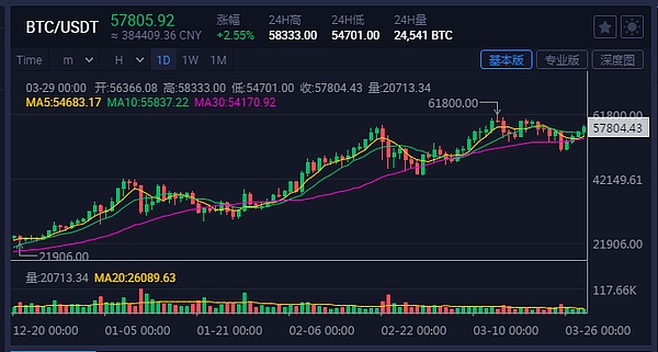 3月29日,经过多日拉锯战后,比特币再次向上突破57000美元/枚,短线走高近800美元,日内涨超2%。
