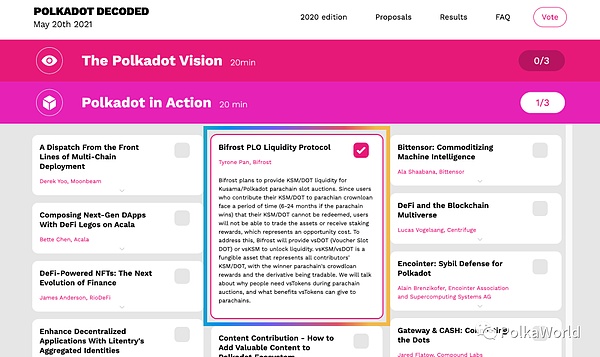 在今年 5月20日 即将开幕的 Polkadot Decoded 中,将汇聚波卡生态及开放贡献者演讲。Bifrost 报名的演讲主题为 “Bifrost PLO Liquidity Protocol”,将为大家详细讲解竞拍卡槽时,流动性衍生品给生态带来的效益。为 Bifrost 投票:https://decoded.polkadot.network/vote/