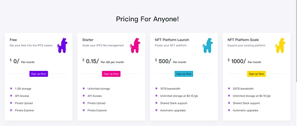 Pinata 则为任何有兴趣开启 IPFS 节点并管理自己数据存储的人,提供了优化的用户使用体验,该网站并未发行代币,而是采取付费的方式供用户使用,其中 NFT 平台套餐为 1000 美元/月。下文中我们还会再稍微详细一些介绍。