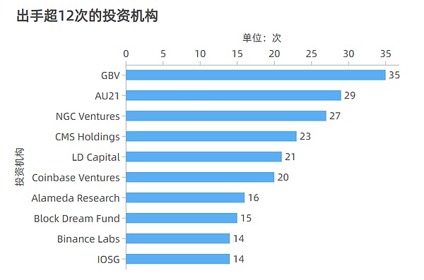 随着融资数量的大增,投资机构的格局也在发生变化。根据链捕手统计,今年第一季度投资数量排名前三的投资机构分别是GBV(Genesis Block Ventures)、AU21 Capital、NGC Ventures,分别分别出手35、29、27次。其它出手超12次以上的投资机构还有CMS Holdings、LD Capital(了得资本)、Coinbase Ventures、Alameda Research、IOSG Ventures、Binance Labs、Block dream fund(OKEx旗下)等。