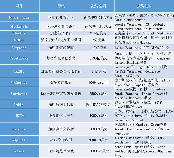 更具体来看,融资金额最高5个项目分别是Dapper Labs、Blockchain.com、BlockFi、NYDIG、BitPanda,融资金额分别达到5.55亿美元、4.2亿美元、3.5亿美元、2亿美元与1.7亿美元,估值均突破10亿美元,此外Chainalysis估值也突破了10亿美元,均成为加密市场的独角兽企业,链捕手下面简单介绍下这几家公司。