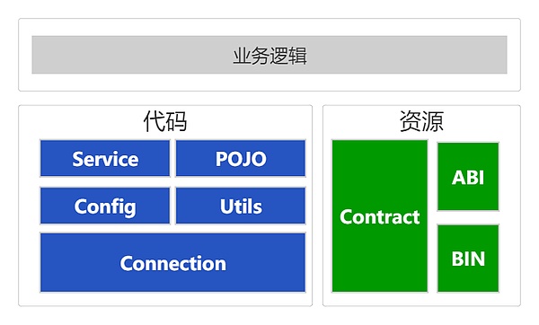 一个典型的区块链应用项目后端,可以分为三块。业务逻辑部分由用户自行定义;代码部分包含了智能合约访问的功能,例如函数入参的封装、交易的构造和推送、链的访问等;资源部分则包含了合约、ABI、BIN。如下图所示: