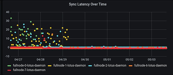 这项优化措施生效后,Filecoin网络已从每60个区块高度处理约375,000个矿工到现在的2,000多个区块高度。这使得块平均同步时间大约快了一倍,并且每日状态快照的大小减少了20GB以上,几乎提高了2倍!平均和最长块同步时间明显减少,并且几乎完全消除了大型归档节点不同步的情况。