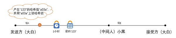 这个过程相当于,小黑自己也上了两把锁,其中哈希锁和大白的那把哈希锁一样,需要用同样的密码才可以打开,时间锁假如为半个小时。