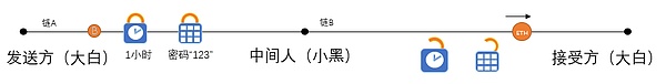在哈希时间锁定机制中,如果时间超过了规定时间,锁定在系统中的代币将会被收回。因此,加上时间锁有效地促进了大白在小黑规定的时间内解开链 B 上的哈希锁,小黑也会因为自己的利益所需而在大白规定的时间段内解开链 A 上的哈希锁。