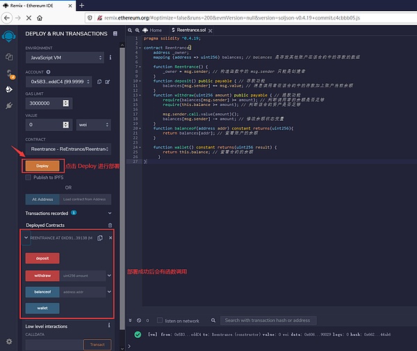 首先使用一个账户 (0x5B38Da6a701c568545dCfcB03FcB875f56beddC4) 扮演受害者,将该合约在 Remix IDE 点击 Deploy 按钮进行部署。
