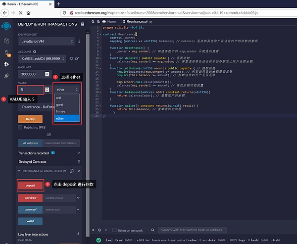 在部署合约成功后在 VALUE 设置框中填写 5,将单位改成 ether,点击 deposit 存入 5 个以太币。
