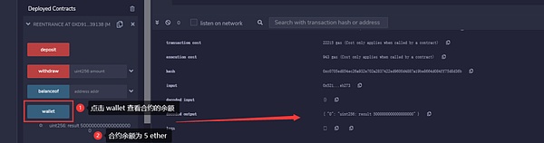 点击 wallet 查看该合约的余额,发现余额为 5 ether,说明我们的存款成功。