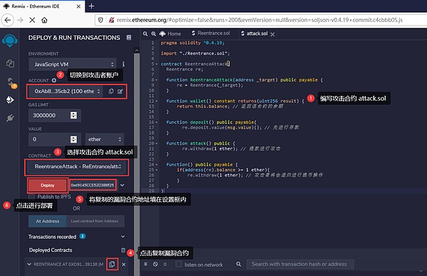 使用另外一个账户 (0xAb8483F64d9C6d1EcF9b849Ae677dD3315835cb2) 扮演攻击者,复制存在漏洞的合约地址到 Deploy 的设置框内,点击 Deploy 部署上面的攻击合约。