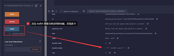 部署成功后先调用 wallet() 函数查看攻击合约的余额为 0。
