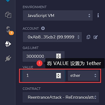 攻击者先存款 1 ether 到漏洞合约中,这里设置 VALUE 为 1 ether,之后点击攻击合约的 deposit 进行存款。