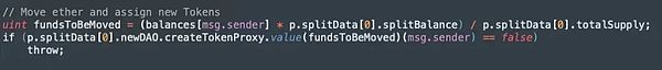 下列代码为 splitDAO() 函数中的部分代码,源代码在 TokenCreation.sol 中,它会将代币从 the parent DAO 转移到 the child DAO 中。平衡数组 uint fundsToBeMoved = (balances[msg.sender] * p.splitData[0].splitBalance) / p.splitData[0].totalSupply 决定了要转移的代币数量。