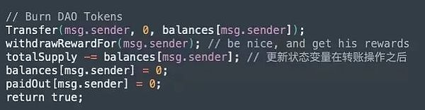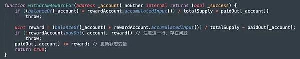 下面的代码则是进行提款奖励操作,每次攻击者调用这项功能时 p.splitData[0] 都是一样的(它是 p 的一个属性,即一个固定的值),并且 p.splitData[0].totalSupply 与 balances[msg.sender] 的值由于函数顺序问题,发生在了转账操作之后,并没有被更新。