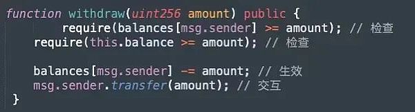 这种方式就是确保状态变量的修改要早于转账操作,即 Solidity 官方推荐的检查-生效-交互模式 (checks-effects-interactions)。