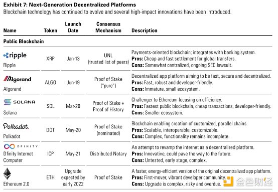 高盛强调,以太坊在区块链上实现去中心化应用 (DApps) 的功能,实现智能合约计算机程序在区块链上执行。高盛报告种着重强调了以下六个公链: