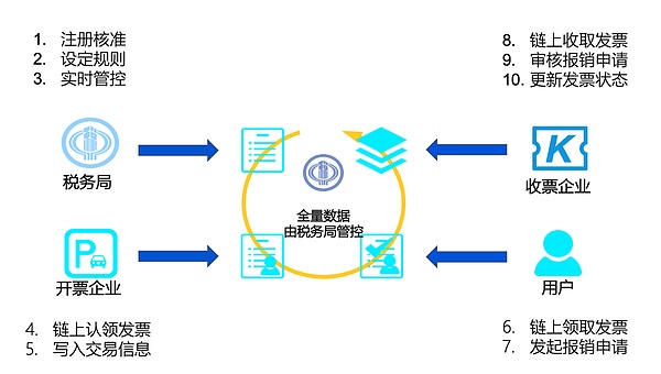 区块链电子发票采用区块链底层技术进行发票无纸化管理,以交易相关人为节点,将交易及发票相关信息实时上链,覆盖了注册、领购、开票、报销、纳税申报全流程,实现了全流程、立体化监管。
