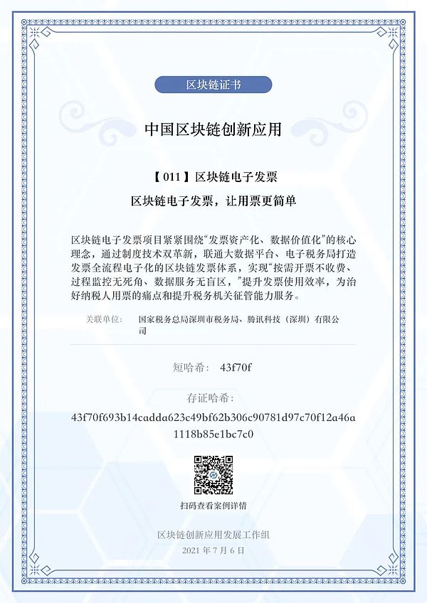 基于此,2018年5月,国家税务总局深圳市税务局与腾讯公司成立“智税创新实验室”,于2018年8月成功推出了全国首个区块链电子发票系统,并受国家税务总局委托在深圳地区开展区块链电子发票试点工作,最终实现将“资金流、发票流”二流合一,将发票开具与线上支付相结合,打通了发票全流程。区块链电子发票以互联网产品的形态诞生,做到税务机关各环节可追溯、业务运行去中心化、纳税办理线上化、报销流转无纸化。