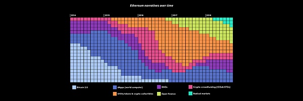 本文写作的目的是描述在不同阶段驱动以太坊发展的主流叙事。我们选择的研究方法是通过分析几年来的 Reddit 帖子、早期社区成员的讨论、文献、已存档的网页、GitHub 帖子、黑客松的开发者作品、个人博客、对主流意见和媒体报道的回忆,追踪社区的氛围。