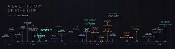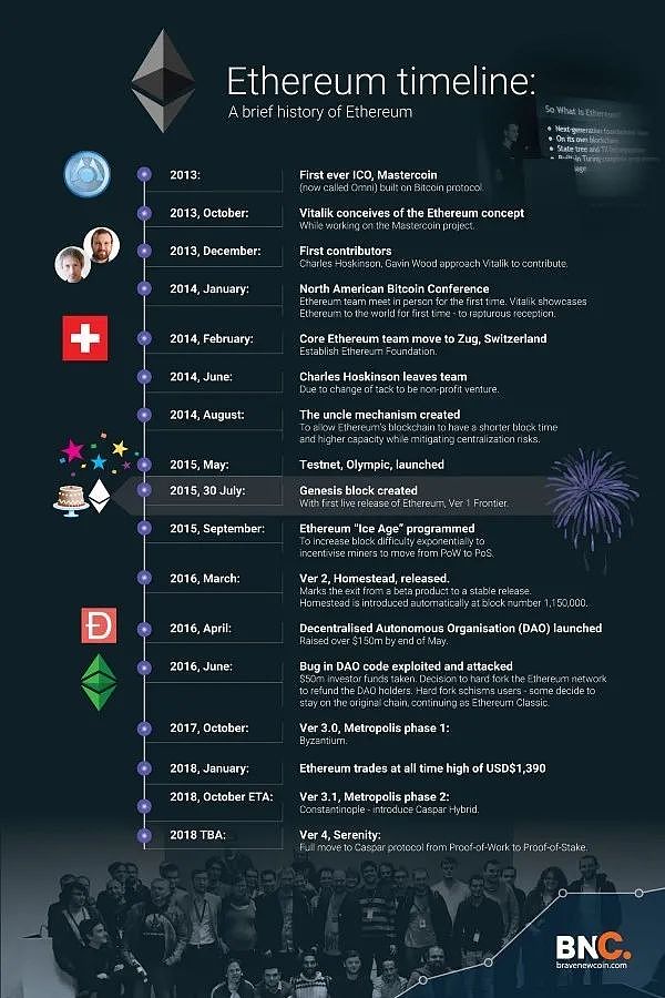 以太坊发展的时间线,引用自 Brave New Coin。倒数第二个里程碑已经过时——推迟到了 2019 年 1 月