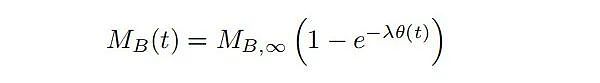 假设是以 M∞ 是作为区块奖励分配的通证总数,那么,在时间 t 之前通过简单铸造分发的通证数量是由其中 λ 给出,当 λ= ln 2/ 6years (其中 γ 介于 0 和 1之间)和 MS,∞ ≡ (1 − γ)M∞ 时,其实就是简单铸造所获得的通证总数。