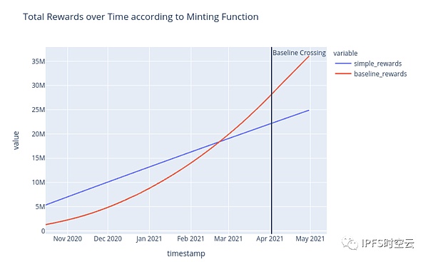 以下图片清楚地绘制出当穿过网络基准线后,相比于简单铸造,在网络达到基线铸造后,将会释放更多的FIL。