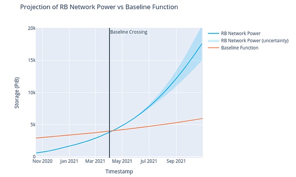 因此,我们可以假设一个逻辑增长趋势,那便是Filecoin网络可以持续增加存储容量,并且保持较高的持续增长率, 即网络的存储容量始终在网络基准线的水平之上。