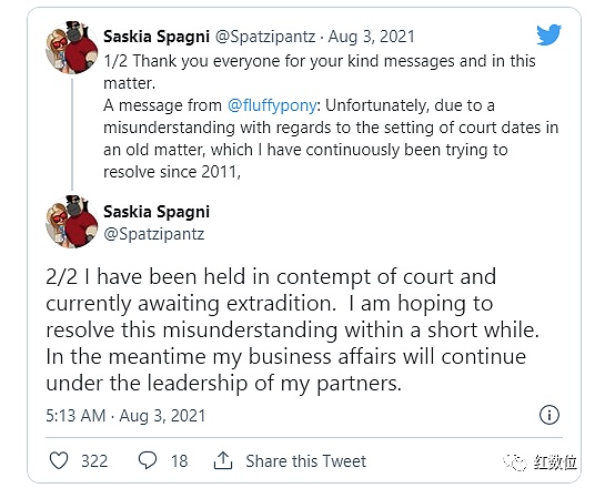 当地时间8月3日,斯帕尼的妻子萨斯基亚斯帕尼在推特上代表丈夫发了一条消息,她称这次逮捕源于“法庭日期设定”中的“误解”。