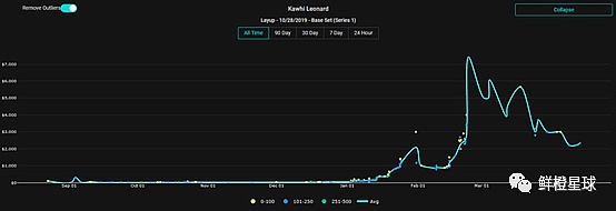 但大多数和我一样3月才进场的人并没有享受到球星卡的升值红利,只有时不时的空投卡包能赚个饭钱。下面Leonard的Series 1普通卡的走势很典型,很明显可以看见1月下旬有一个涨幅(Series 2推出),然后2月底到3月初的FOMO(15K的卡成为限量版,NBA球星开始集卡