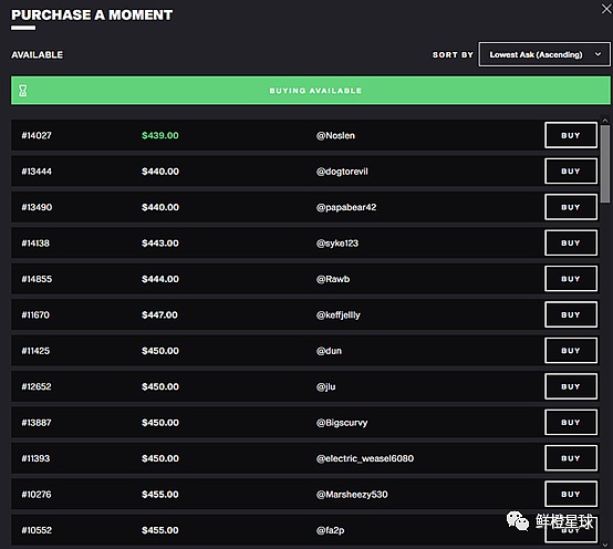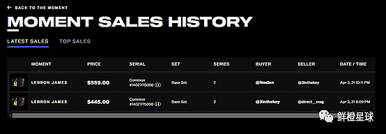和股票不同的是,NFT的所有交易都是在区块链上的。也就是说,任何人都可以看见这张球星卡的所有交易历史,包括卖家的成本是多少。从历史上看是用户direct_msg开$9卡包得到的,以$445的价格卖给了3inthekey,3inthekey两小时后又以$559的价格卖给了现在的持有者Noslen,25%的回报。而Noslen现在准备以$439的价格割肉了, 预计亏损22%