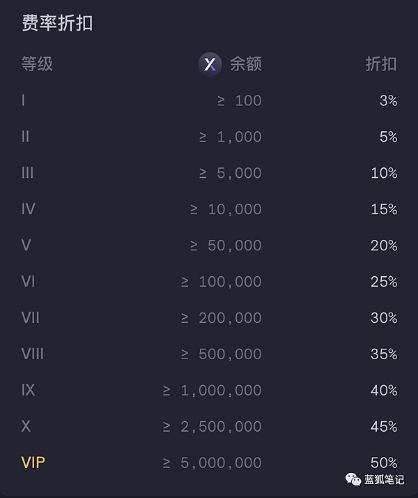 dYdX的代币DYDX主要是治理代币,可用来对其发展进行社区决策。同时,它可以作为其平台上用户交易的费用折扣,具体如下图: