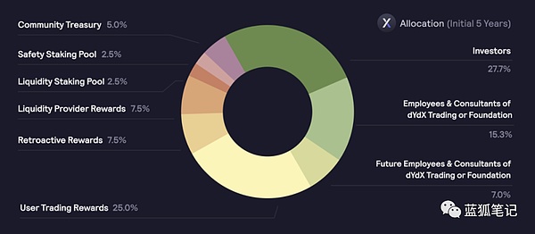 DYDX代币一共10亿枚,分5年释放完毕,之后可能会有每年2%的增发,不过具体会由社区进行决策,这也是在5年之后事情了。在这五年的释放比例中,流动性提供和质押共获得10%的代币奖励(2.5%的质押、7.5%的流动性提供);社区财库5%;回溯奖励7.5%;交易奖励25%。剩余50%分配给投资者以及团队等。