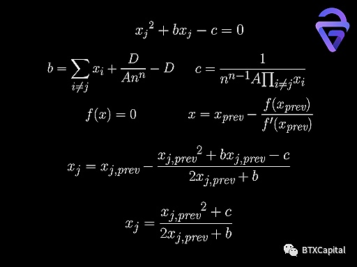 该方程可以简化为二次形式。可悲的是,现在链上Vyper语言里没有可以解二次方程的数学库。因此,StableSwap 使用了牛顿法来求解 xⱼ。迭代公式每次迭代都将其精度加倍。因此,可以在设定的gas上限内计算可接受的 xⱼ。最后,交换前后 xⱼ 之间的差值将是购买的代币 j 的数量。