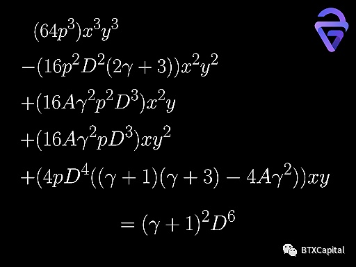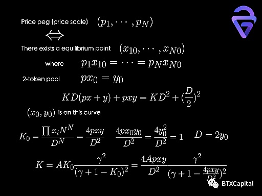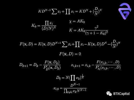 缩放后的代币数满足与 StableSwap 类似的等式。以最简单的 2币流动性池为例,做市商函数可以用 A、γ、p、D、x、y 表示。该函数可以简化为关于 x, y 的三次函数(关于 D 的六次函数)。