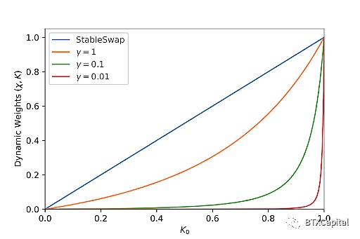 我们可以从上图中了解Curve V2 如何使价格转变得平滑。它实际上使动态权重在远离平衡点时迅速下降。γ值越小,下降越快。使动态权重快速下降到零本质上相当于强制函数表现得更像 CPMM,即使流动性池只是有一点不平衡。
