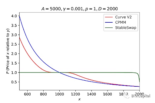 与CPMM和StableSwap相比,Curve V2的价格函数: