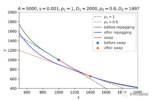 也可以绘制代币 x 相对于代币 y 的价格曲线。在平衡点 (1000, 1000) 附近Curve V2 价格函数恒定。与 StableSwap 相比,Curve V2 略微延迟了价格变动,而不是完全延迟。与 CPMM 相比,随着交易量的增加,价格开始以较小的滑点做出反应。总而言之,Curve V2 在平衡点附近实现了非常小的滑点,并且在其他区域比 CPMM 实现了更好的滑点。至于其他非1的价格锚定,我们只需更改上面三次/六次方程中的 p。因此,锚定价格的问题也解决了。