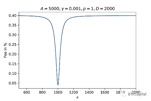由于上面讨论的Curve V2 的做市商特性,将交易费用设为2级交易费用与动态权重的线性组合是合理的,衡量我们离平衡点有多远(当前价格变动是否更像是 StableSwap 或 CPMM)。Curve V2 选择的 fmid 和 fout 值分别为 0.04% 和 0.4%。下图展示了 2 代币池中的费用如何变化(假设没有价格重锚或流动性变化):