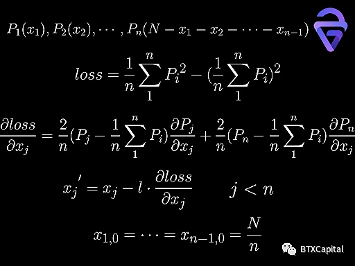 因此,我们引入了一种在机器学习等领域常用的技术,称为梯度下降。我们将损失函数定义为不同价格函数值的方差。在选择一个起始猜测(一个简单的、不知情的猜测可以是每个池中的交易量相等 N/n)后,我们可以迭代(通过损失函数相对于该变量的偏导数改变每个交换量,乘以学习率 l) 以获得最佳结果,在一定的误差接受范围内。