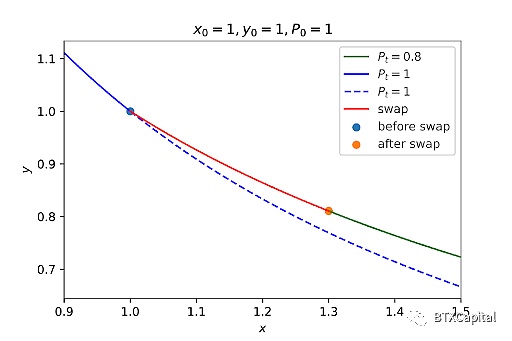 从上图中我们可以看出,交易后的点不在新的做市商函数上(蓝色和蓝色虚线)。如果当前市场价格低于当前储备的现货价格,则流动性池也可能没有任何动力回到 (x0, y0)。