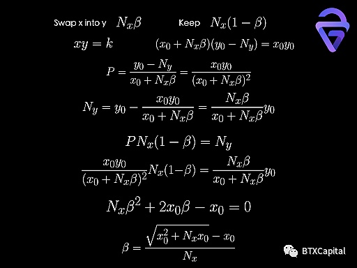 我们只有代币 x。不难计算我们需要交换多少,以便交换后每种代币的价值相等。也很容易证明 β 总是在 0 和 1 之间,这意味着一个合理的结果。但是,交易后的价格可能与存入流动性时的价格不同。因此,我想知道协议是否真的将交换和流动性存入作为一项原子操作。进行交易时也存在价格滑点。到目前为止,Balancer 和 Curve 等协议如何处理单边流动性存入仍然是我们的一个问题。如果滑点很小,则进行上述操作是合理的。