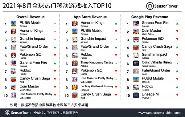 《王者荣耀》长期占据热门移动游戏收入榜榜首。SensorTower数据显示,2021年1月-8月,该作在全球APP Store以及Google Play市场吸金共计约21.1亿美元。