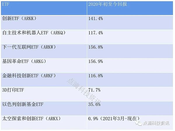 2020年,在所有美国主动管理基金中,ARK旗下的五只基金平均收益率达到170%,ARK也从此前的名不见经传一举成为美国2400多只基金中排名第一的基金。不过由于2021年以来科技股持续下跌以及中概股的持续调整,ARK基金的投资收益也有所下降,但是综合来看,该基金自2020年以来的回报率也是非常惊人的。