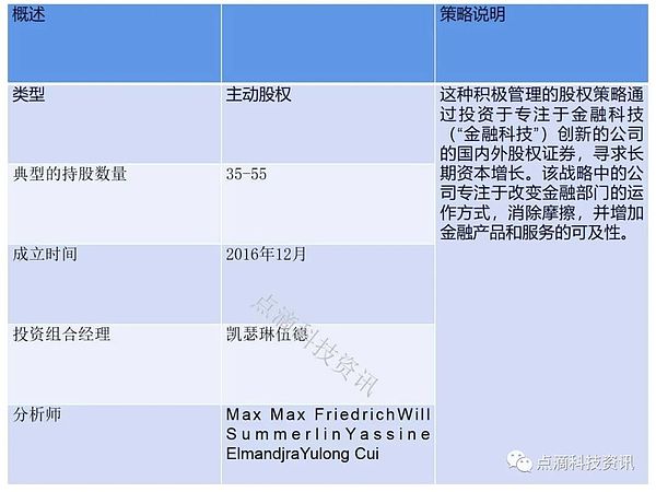 同时,该基金明确金融科技创新公司是指可能开发、使用或依赖创新支付平台和方法、销售点提供商、电子商务、交易创新、商业分析、减少欺诈、无摩擦融资平台、P2P借贷、区块链技术、中介交易所、资产配置技术、移动支付以及风险定价和汇集聚合(保险)的公司。